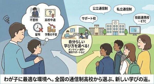 「子どもの不登校」「高校中退」「留年」「できるだけ学費を抑えたい」…思いがけない教育の課題に直面したとき、多くの保護者が不安を抱えています。通信制高校は、そんな生徒や保護者に新たな学びの選択肢を提供しています。