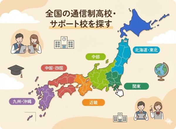 全国には「トライ式高等学院」「N高等学校」「クラーク記念国際高等学校」などの大手通信制高校・サポート校から、域に密着した個別対応の小規模校まで、多様な通信制高校があります。
