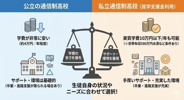 さらに、授業料だけでなく教材費やスクーリング費用など、その他の経費に対する支援策も存在します。国の「私立高等学校等奨学給付金」制度では、生活保護世帯や住民税非課税世帯などを対象に、年額52,100円~152,000円の給付が行われます。こうした制度を活用することで、家計の事情にかかわらず学びの選択肢を広げることが可能です。