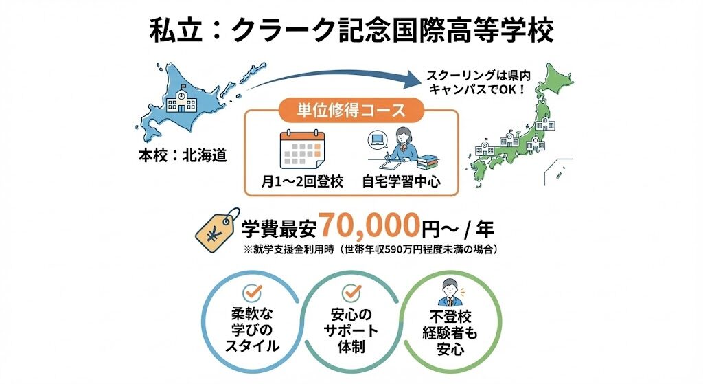 | クラーク高校 | 通信制 | 70,000円〜 | 北海道 | 毎月1日 | 資料請求 | |||||||