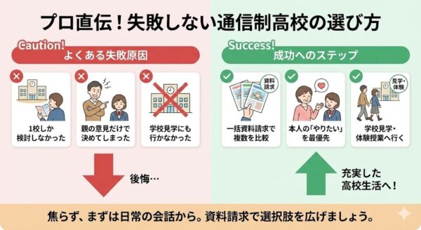 「心のエネルギーが少ない状態のときに学校見学に行くと、最初に行った高校に決めてしまいがち」ということ。