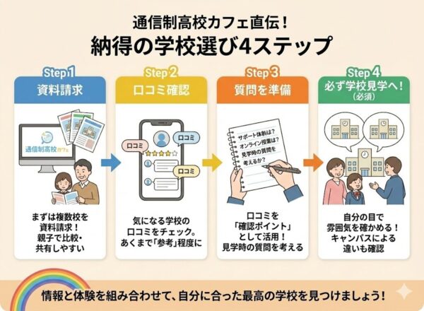 通信制高校への入学を検討する際には、これらの各種支援制度を正しく理解し、活用するための手続きや必要書類を早めに確認しておきましょう。自治体独自の助成制度の申請期限や要件は地域ごとに異なる場合があるため、情報収集を十分に行ったうえで学費負担を軽減し、安心して学びの場を選択することが重要です。