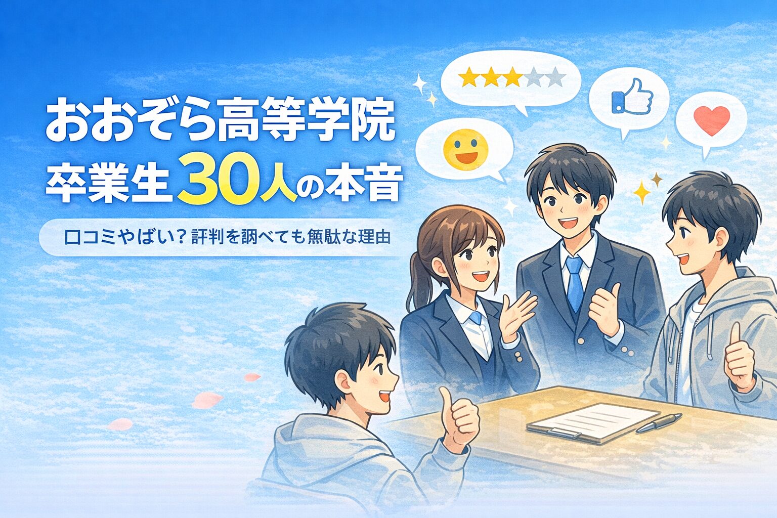 当サイトではおおぞら高等学院の卒業生11名から集めた率直な感想や体験談も掲載。実際に通った人たちの生の声を知ることで、ご自身やお子様に合っているかどうかの判断材料としていただければと思います。